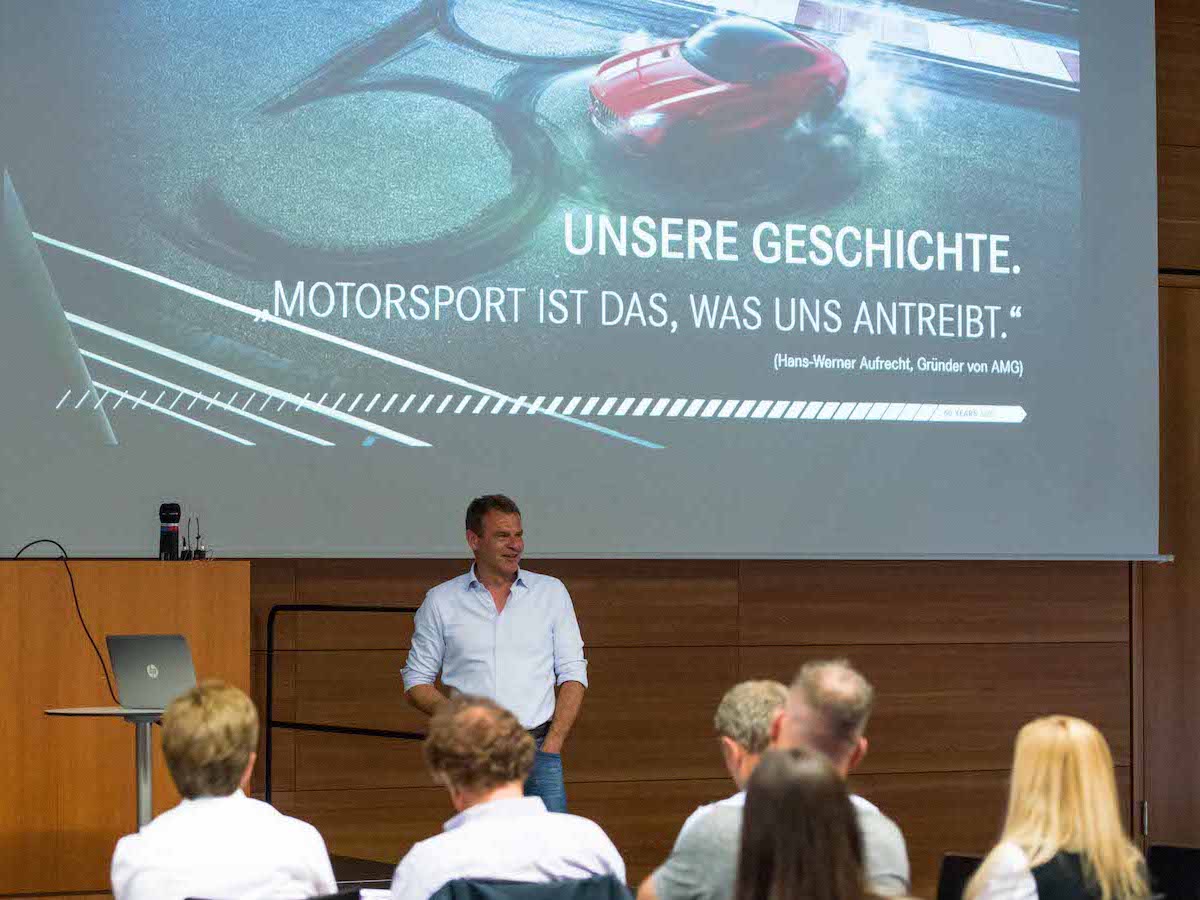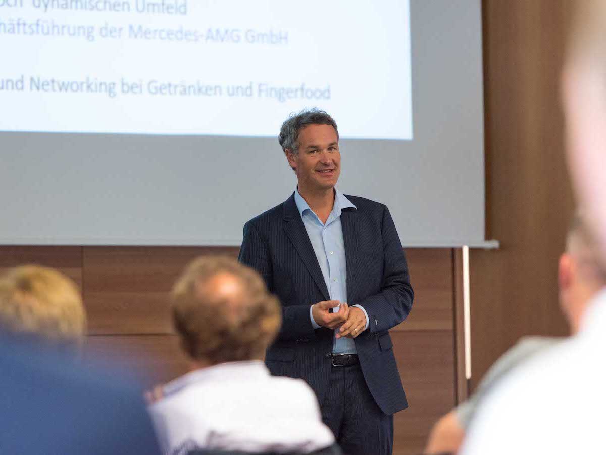 Im Mittelpunkt des Events standen drei werthaltige Vorträge, die einen gelungenen Brückenschlag von „Wissenschaft zu Praxis“ boten. Nach einem Grußwort von Prorektor Prof. Dr. Bürkle übernahm Prof. Borgmeier den Start mit der Fragestellung „Digitalisierung und Leadership of the Future: Führen uns bald nur noch Maschinen?“ Es folgte Stefan F. Gross mit dem Thema „Führungskultur 4.0: Zukunftsfähige Führung als Schlüssel für den digitalen Wandel.“ Den dritten Teil bildete der Vortrag „Führung in einem innovativen und hochdynamischen Umfeld“ von Tobias Moers, dem Vorsitzenden der Geschäftsführung der Mercedes-AMG GmbH. Auf jeden Vortrag folgten angeregte Diskussionen zwischen Referenten und Teilnehmern. Moderiert wurden die Gespräche von Tamara Stamerra, die auch die Gesamt-Moderation des Abends innehatte.
